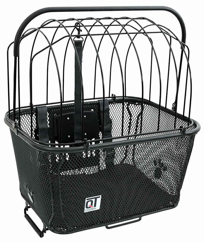 Univerzální drátěný koš na kolo s ochrannou klecí pro montáž na zadní nosič s možností montáže na řidítka.